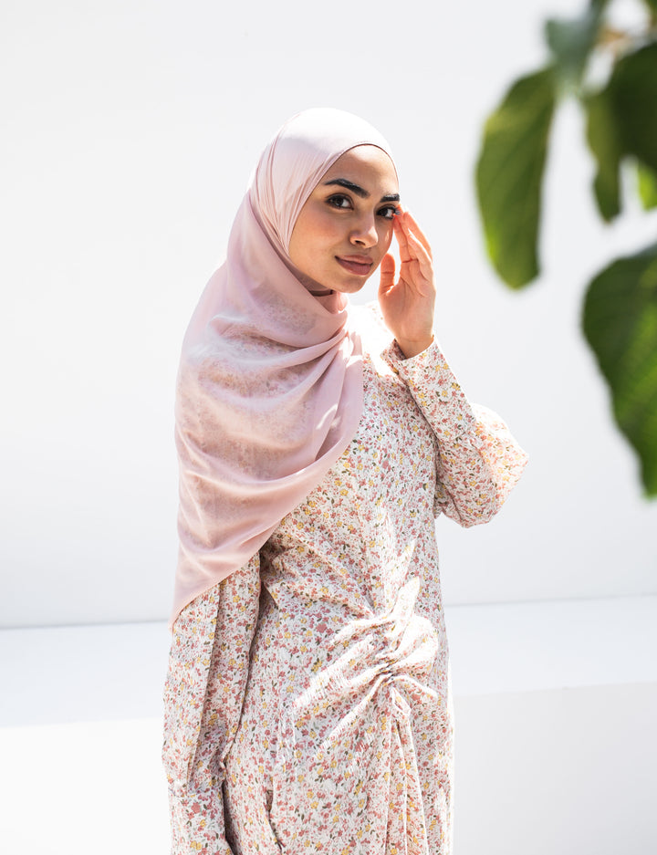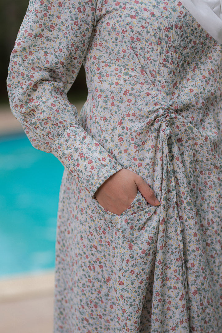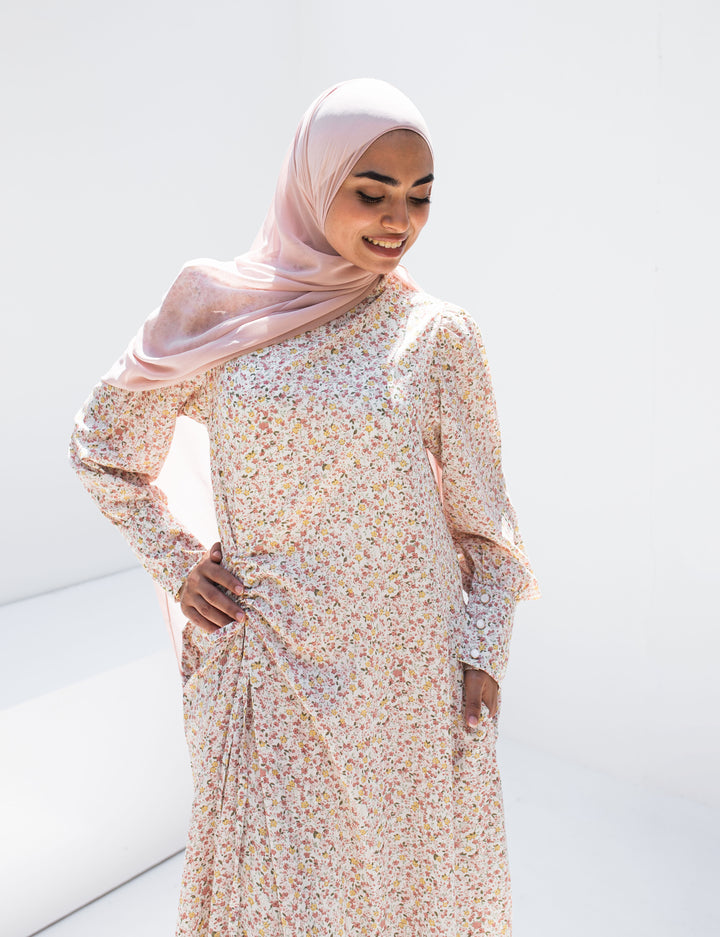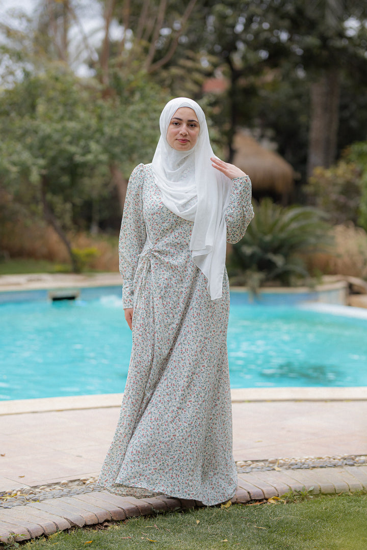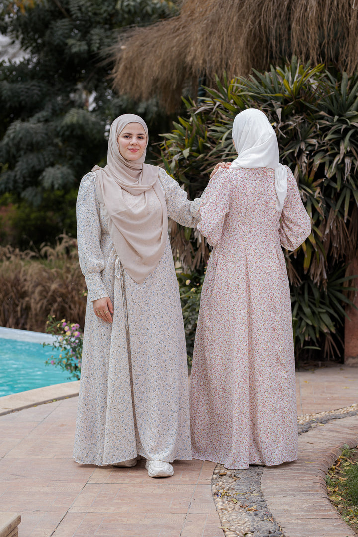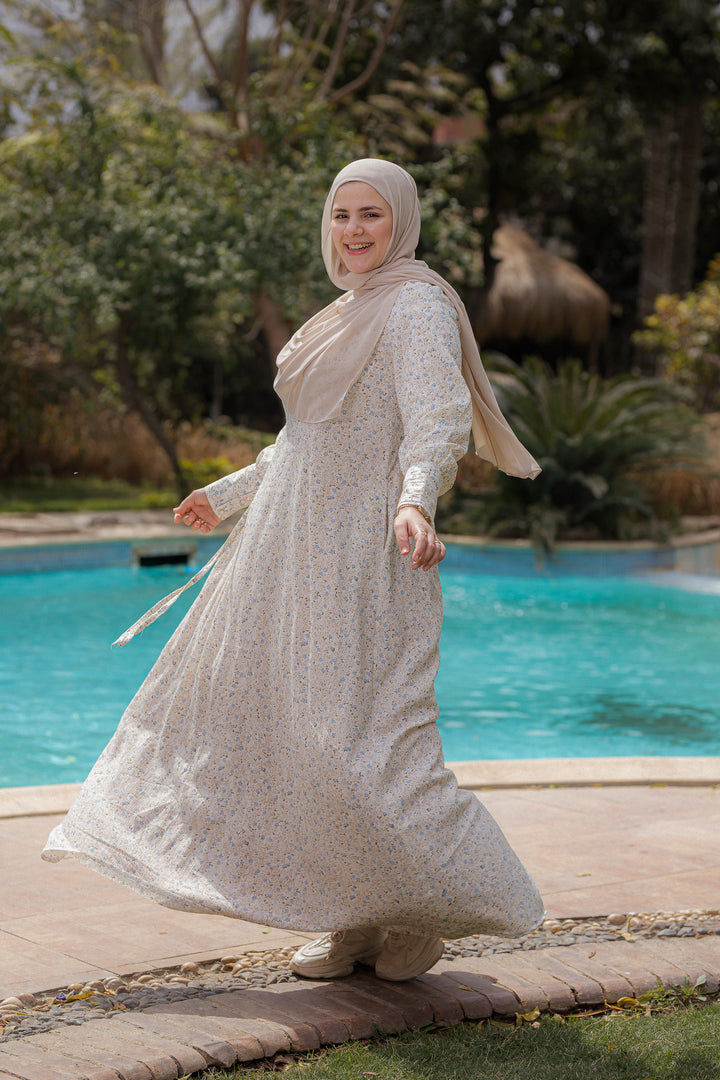 يتميز الفستان بقصة فضفاضة مريحة ونقشات ناعمة