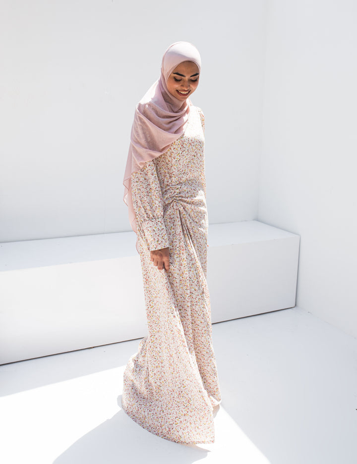 التصميم مزوّد بتفصيلة جانبية مجمعة وعقدة أنيقة