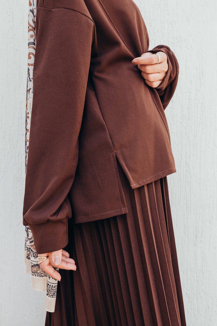 حياء عملت لك بلوزه عملية وأنيقه مناسبه لأكثر من أستايل من الخلف اطول قليلا لتكون ساترة وأنيقة , مصنوعه من خامه الأسكوبا الكريب مناسبه للبس طوال العام ماعدا أوقات الحر الشديد , يمكن لب