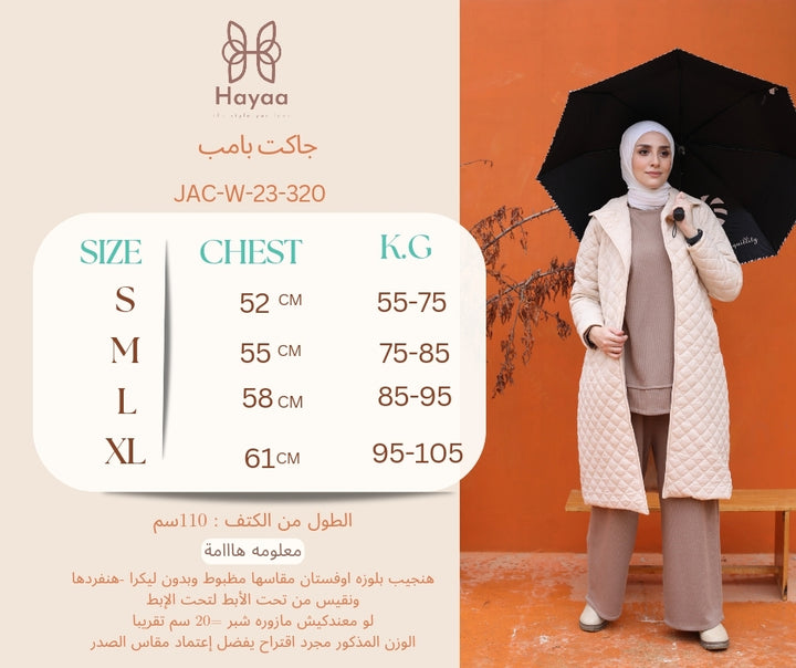 جاكيت وتربروف بامب لأن حياء بتهتم بأدق تفاصيل احتياجك عملنا لك جاكيت وتربروف بامب عملنا الفايبر مضغوط علشان يدفى وفى نفس الوقت ميخلكيش ضخمه , كمان عملنا الكابتونيه المسافات بينه صغيره بحيث تظهرى ارفع