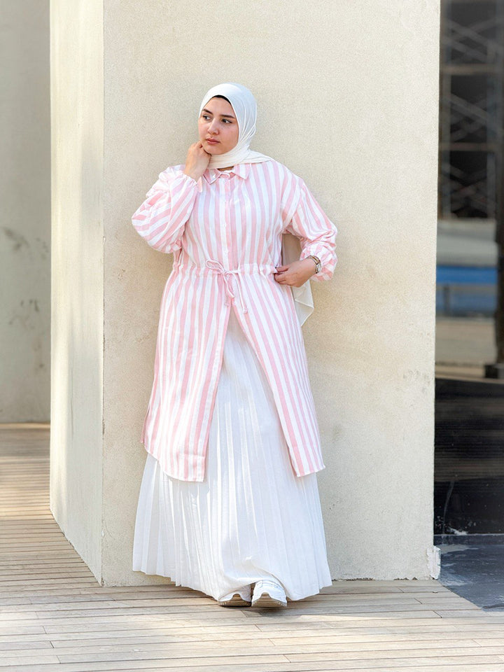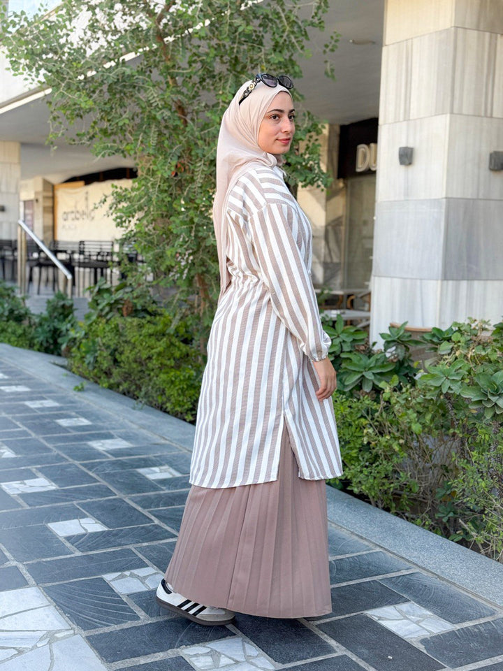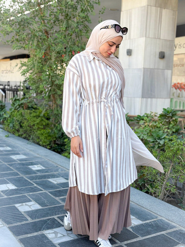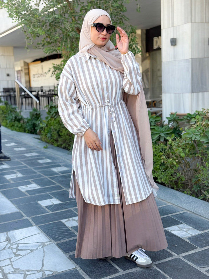 شميز صوف مقلم، فيه حزام من الداخل تقدري تستخدميه تربطيه أو تسيبيه. مزود بزراير شفافة، شكله بسيط وأنيق.