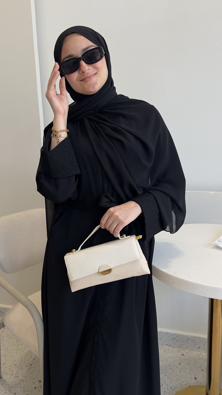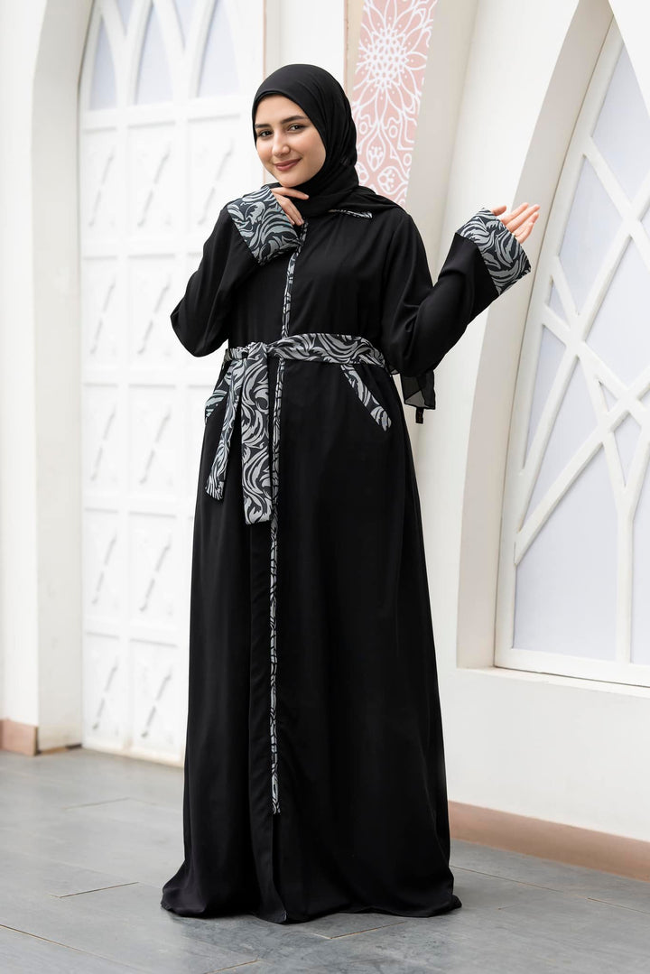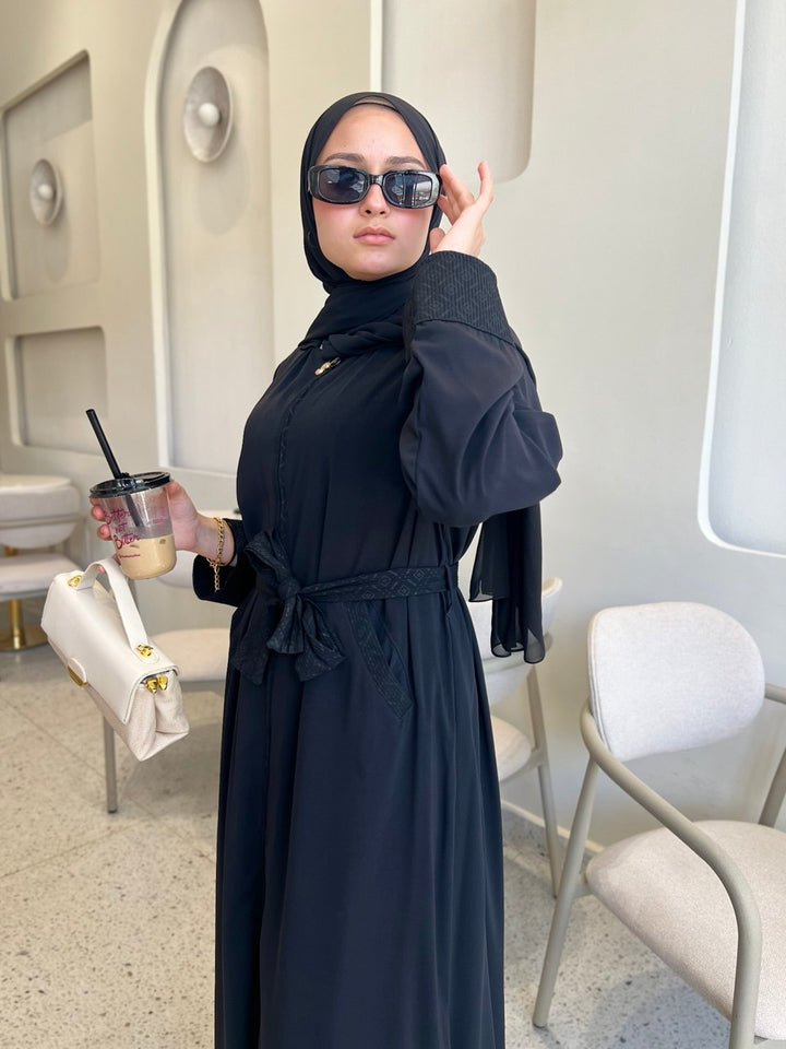 Elegant black crepe abaya with Riviera-style collar detailing. Features a full-length zipper, handy side pockets, and an adjustable belt for a flattering fit. Wear it open or closed for a versatile, chic look—perfect for everyday elegance or special occasions.