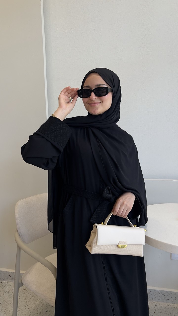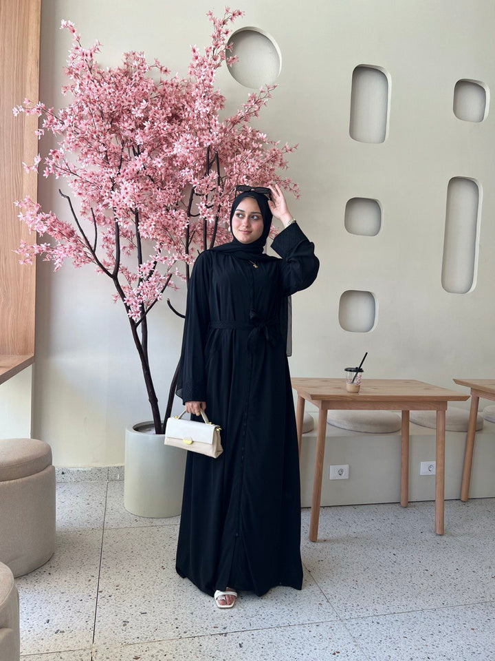 Elegant black crepe abaya with Riviera-style collar detailing. Features a full-length zipper, handy side pockets, and an adjustable belt for a flattering fit. Wear it open or closed for a versatile,