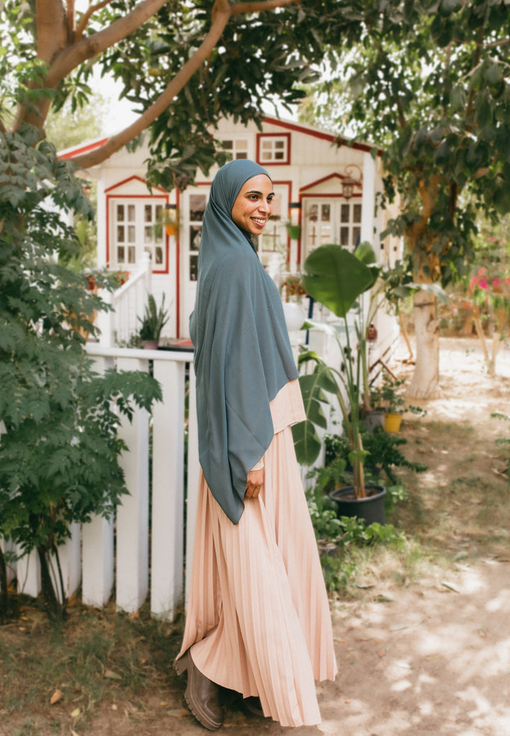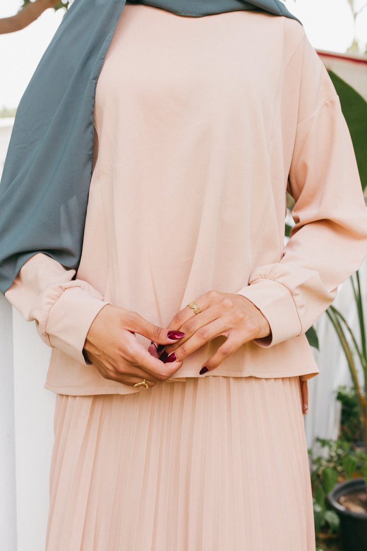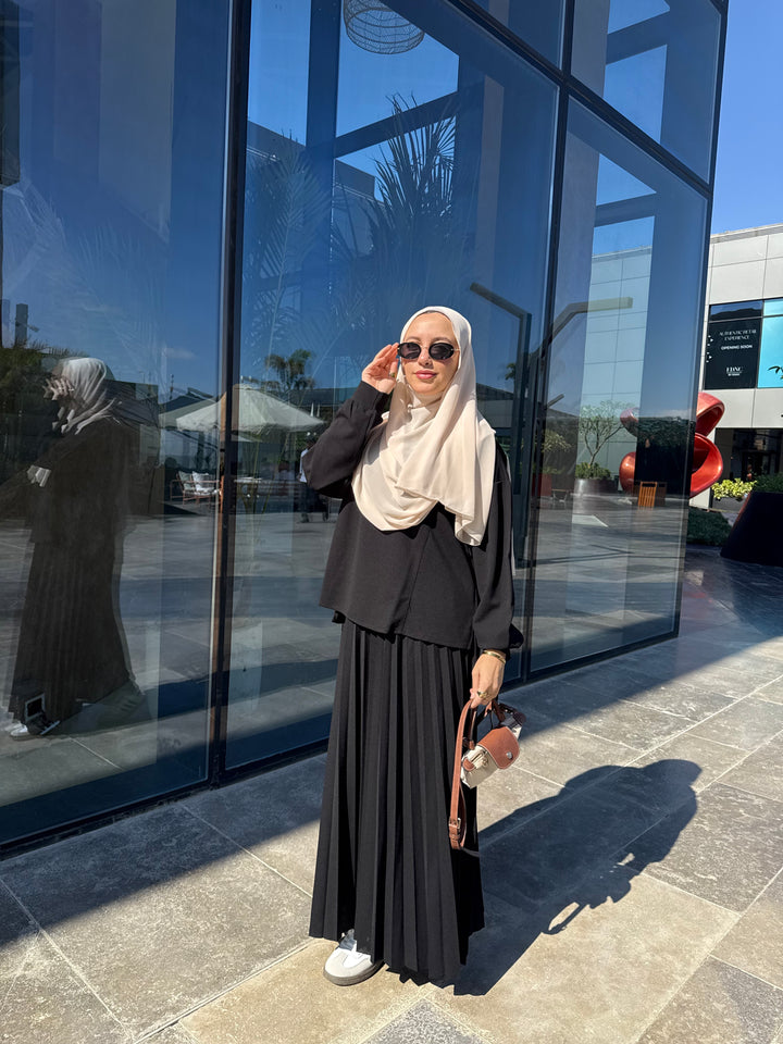Oversized round-neck princess blouse made from soft scuba crepe. Slightly longer at the back for modesty, versatile for multiple styles, and perfect for year-round wear. Can be paired with matching skirts for a set or mixed with other skirts. Available in one size, fits up to 95 kg.