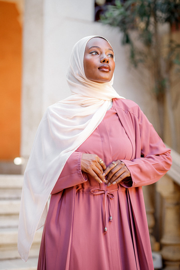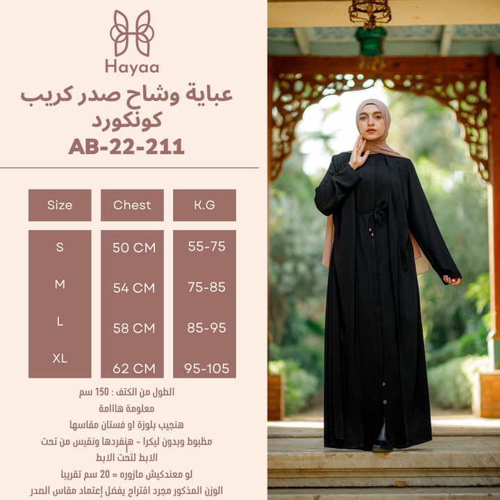 Elegant crepe abaya with matching chest scarf, crafted from soft, breathable fabric for ultimate comfort. Features a front-open design with hidden buttons, an inner belt for a flattering fit, and ver