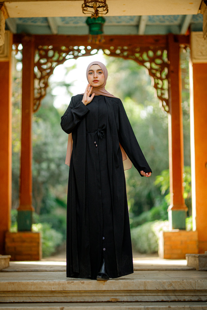 Elegant crepe abaya with matching chest scarf, crafted from soft, breathable fabric for ultimate comfort. Features a front-open design with hidden buttons, an inner belt for a flattering fit, and versatile styling—wear it open or closed for casual days, work, or simple occasions. A timeless black option makes it perfect for travel and umrah.