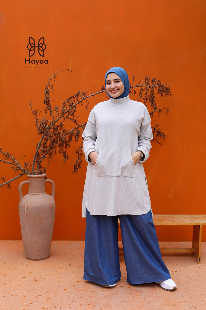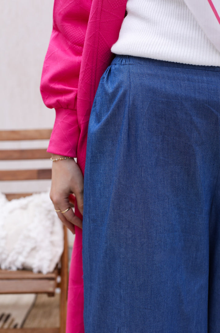 Wide 100% cotton denim pant-skirt with elastic back and front darts — modest, practical, and perfect for everyday casual style.